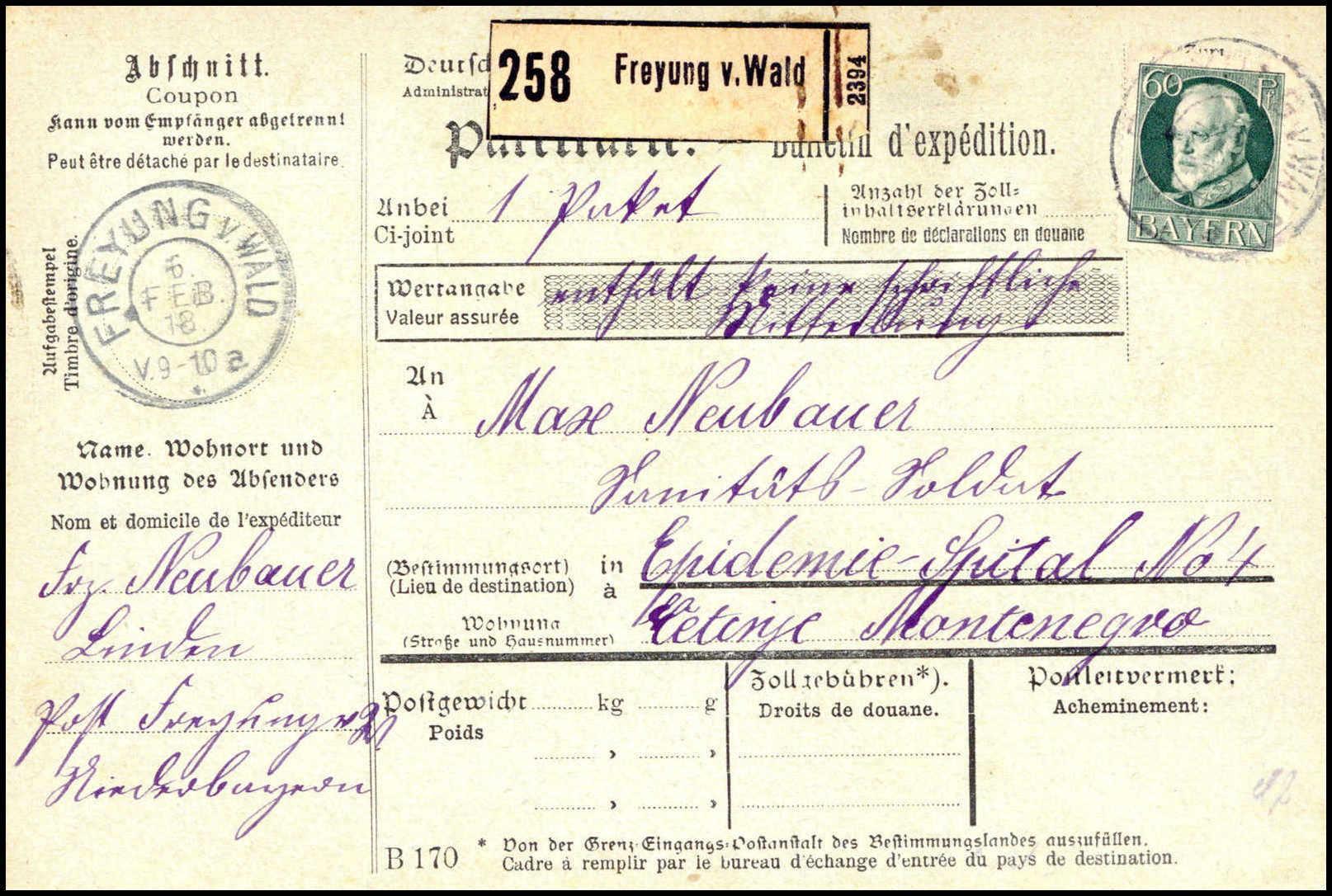 60 Pfg., Einzelfrankatur auf Paketkarte mit Stempel FREYUNG 6/2 18 an einen Sanitäts-Soldaten im Epidemie-Spital in Montenegro. Selten