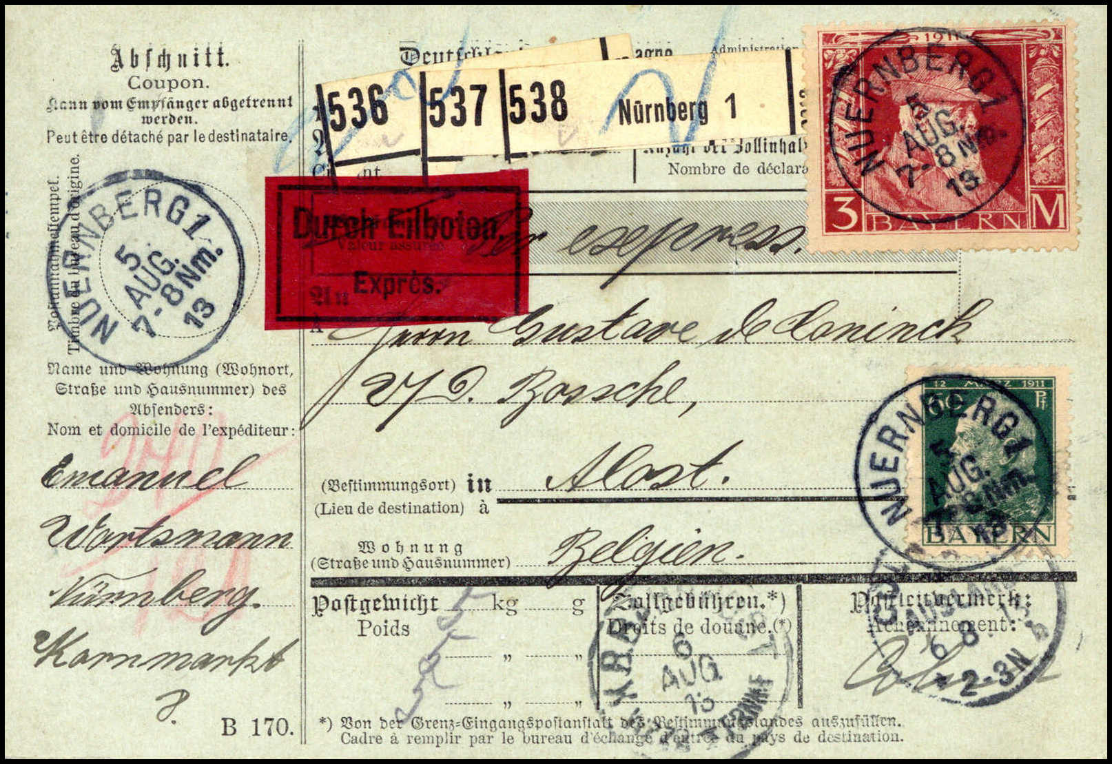 3 Mk. mit 60 Pfg. auf seltener Eilboten-Paketkarte von Nürnberg (5.8.13) nach Belgien