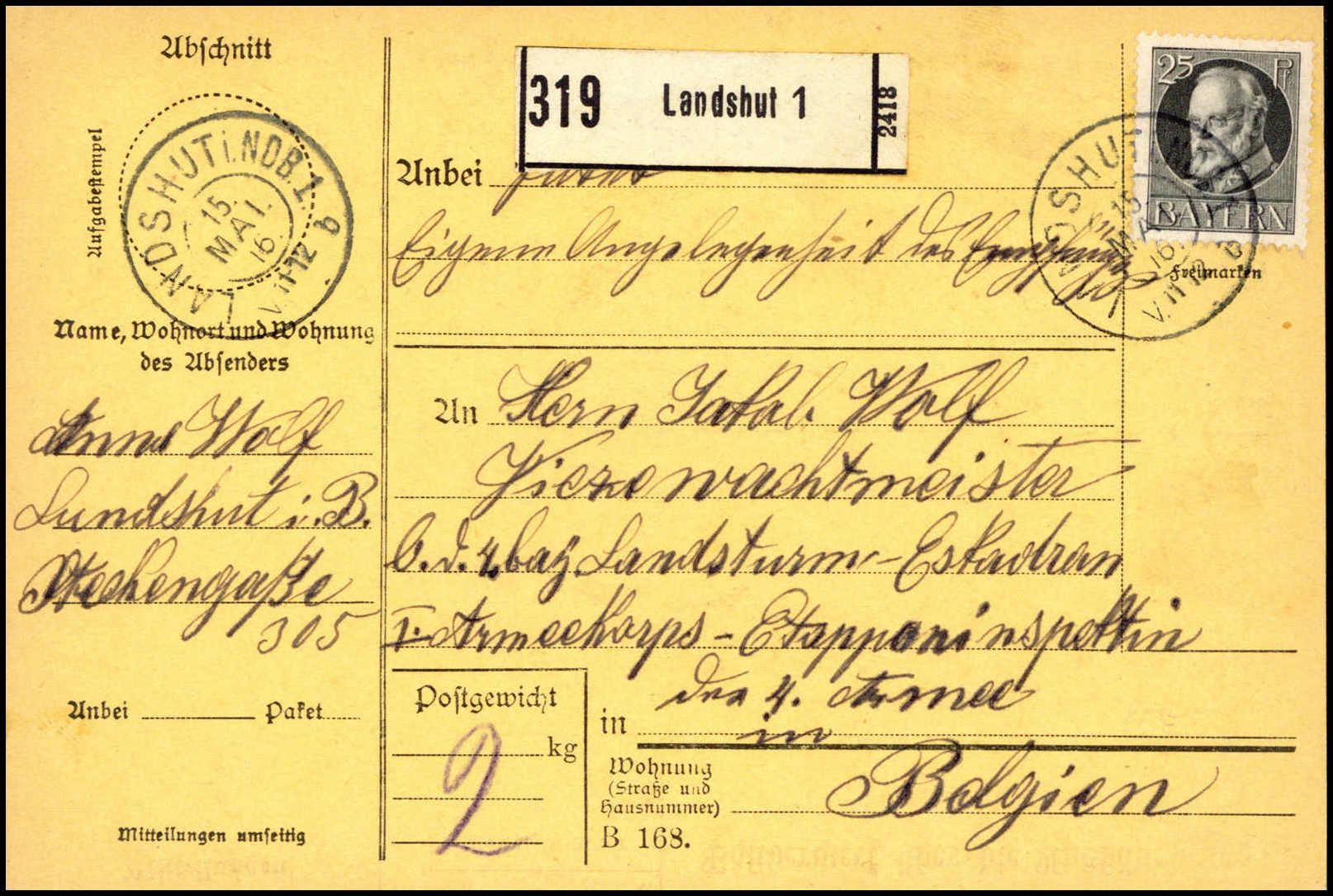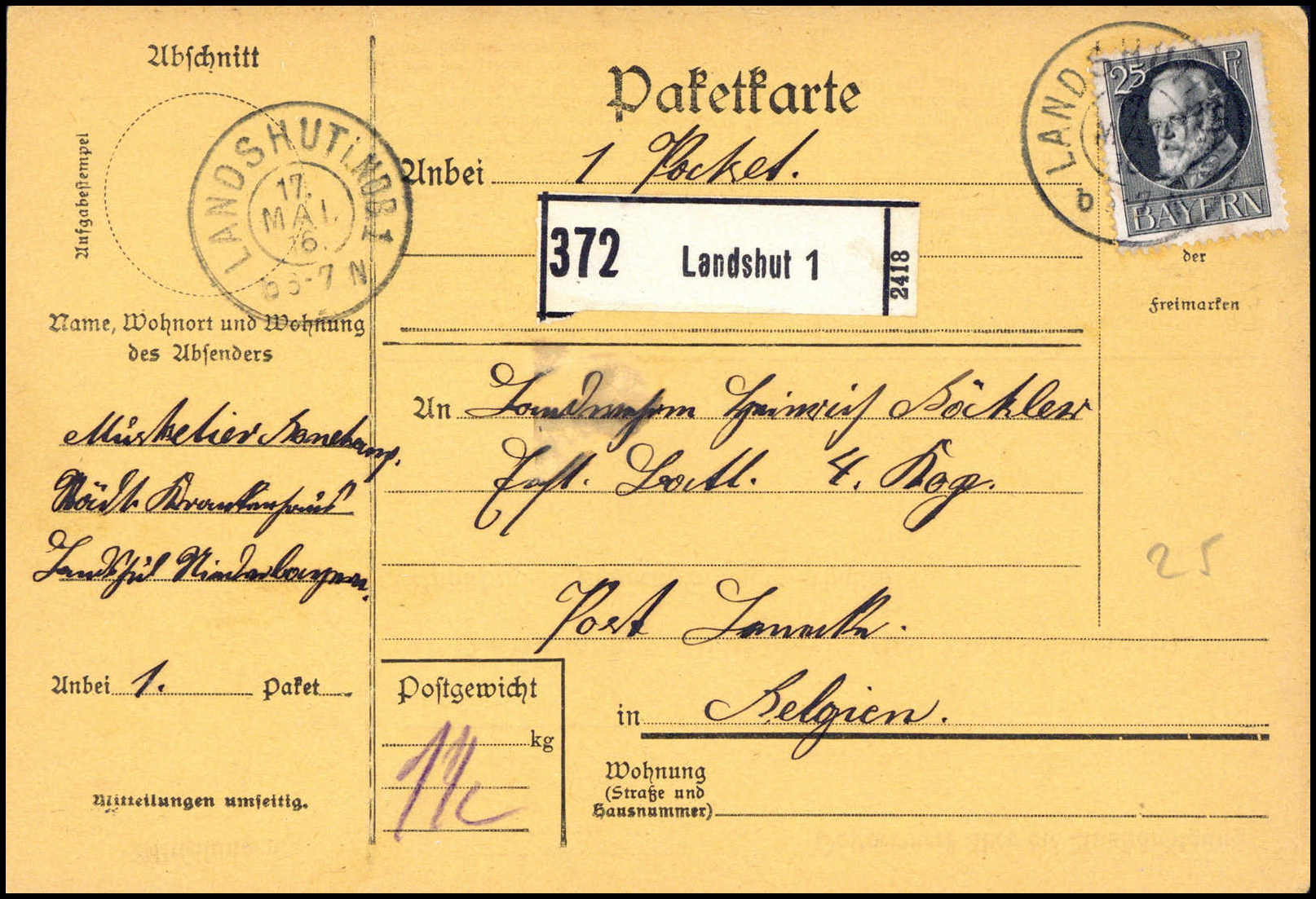 25 Pfg., Einzelfrankatur auf tadelloser Feldpost-Paketkarte mit Stempel LANDSHUT 17/5 16 nach Belgien