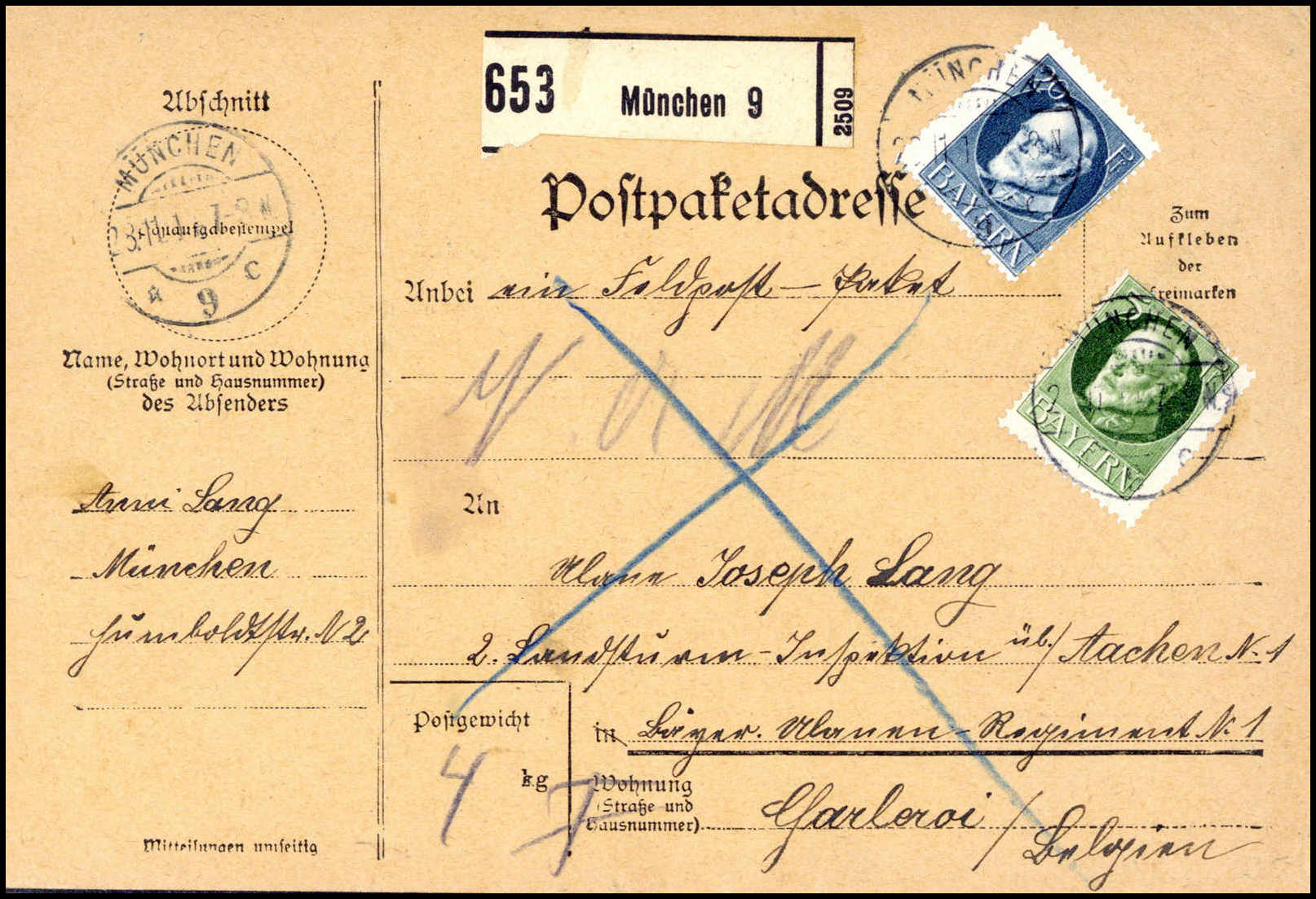 5 und 20 Pfg. auf seltener Feldpost-Paketkarte mit Stempel MÜNCHEN 21/11 14 nach Belgien