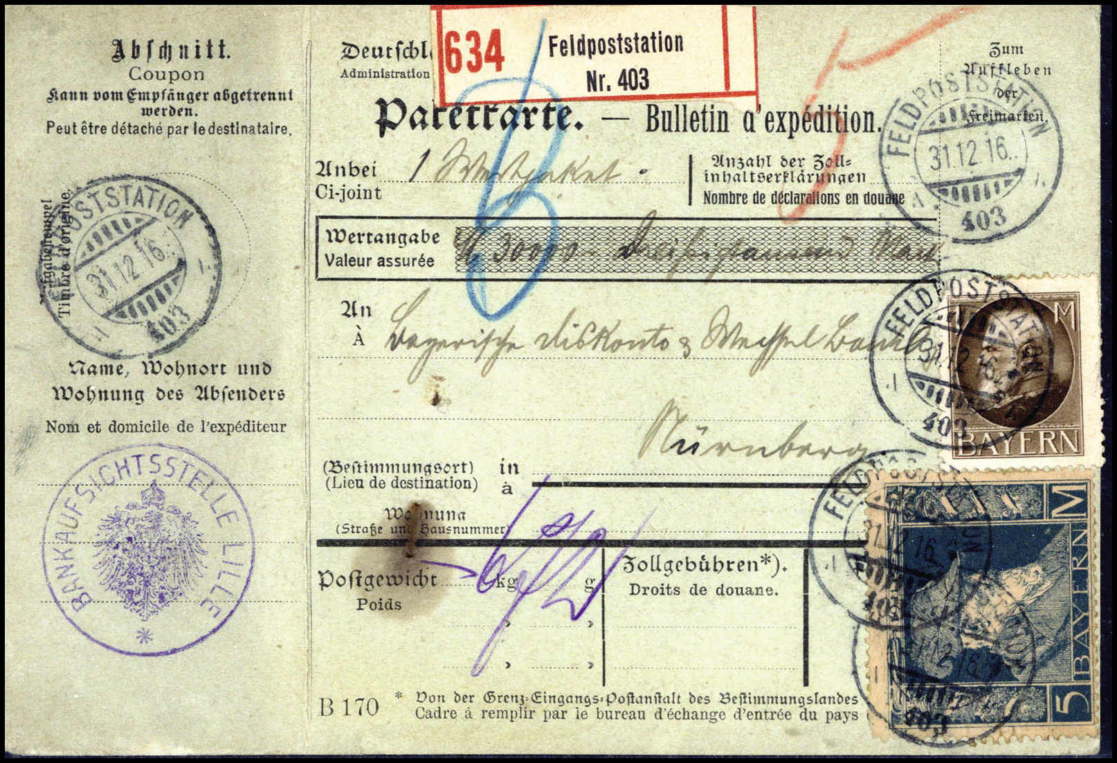 Feldpoststation Belgien 20 und 60 Pfg. mit 1 Mk., zweimal 2 Mk. und 5 Mk. vs. und rs. auf äußerst seltener Feldpost-Wertpaketkarte über 30.000,- Mk. nach Nürnberg, klare Stempel FELDPOSTSTATION 403 31/12 16. Links unten Adler-Stempel