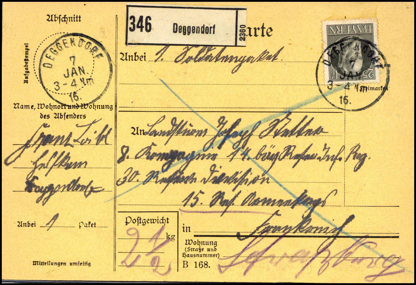 25 Pfg., Einzelfrankatur mit K1 DEGGENDORF 7/1 16 auf Soldaten-Paketkarte nach Frankreich