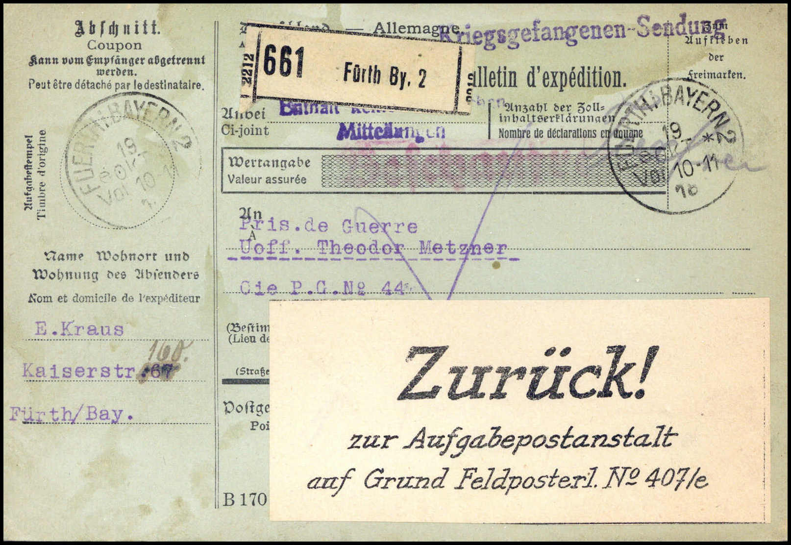FUERTH i.BAYERN 19/10 18, K1 auf unfrankierter Paketkarte mit L1 "Kriegsgefangen-Sendung" nach Paris und wieder retour mit Aufkleber "zurück! zur Aufgabepostanstalt auf Grund Feldposterl. No407/e"
