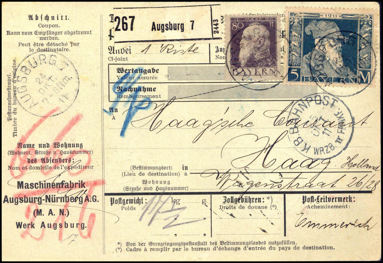 3 und 5 Mk. sowie 80 Pfg. vs. und rs. auf Auslands-Paketkarte in die Niederlande, klare K1 AUGSBURG 7. 24/10 11. Trotz kl. Mängel eine interessante Karte