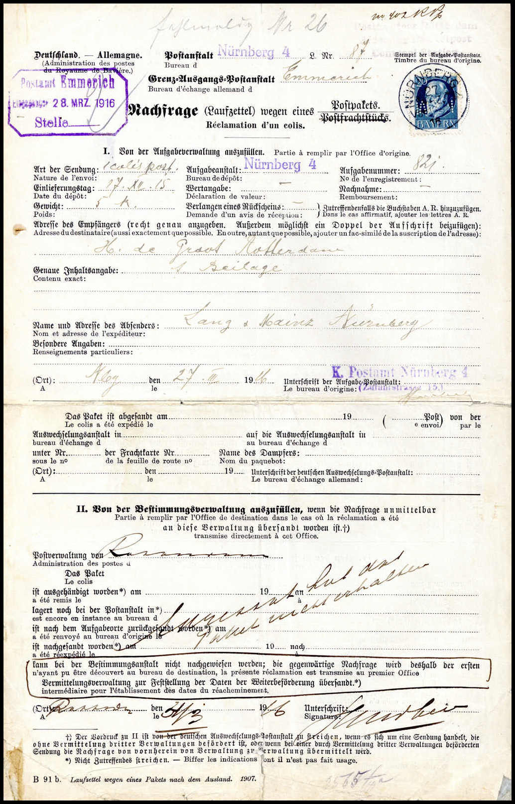 20 Pfg. mit Firmenlochung "L&M" (Firma Lang und Mainz) auf vorgedrucktem Laufzettel "Nachfrage wegen eines Postpakets" mit K1 NÜRNBERG 27/3 16 für eine verlorengegangene Sendung nach Rotterdam. Trotz stärkerer Gebrauchsspuren ein sehr