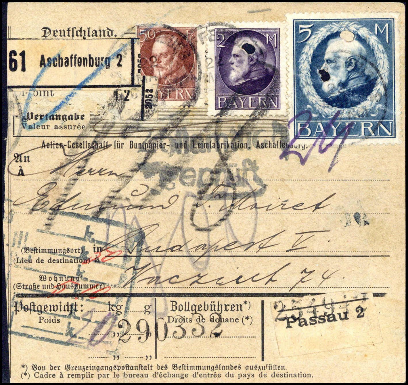 5 Mk., jeweils mit 50 Pfg. und 2 Mk. auf zwei Paketkarten von Aschaffenburg (Mai 1918) nach Budapest. Stärkere Gebrauchsspuren