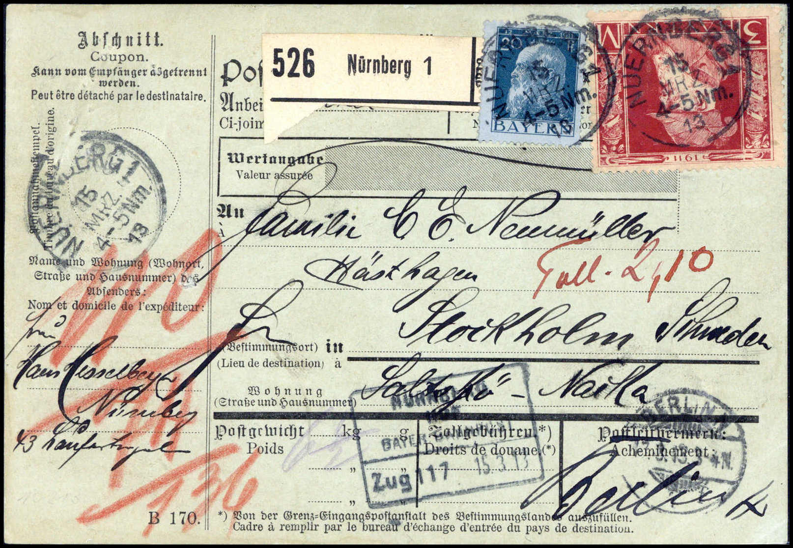 3 Mk. mit 20 Pfg. auf kpl. Paketkarte nach Stockholm, Stempel NUERNBERG 15/3 13