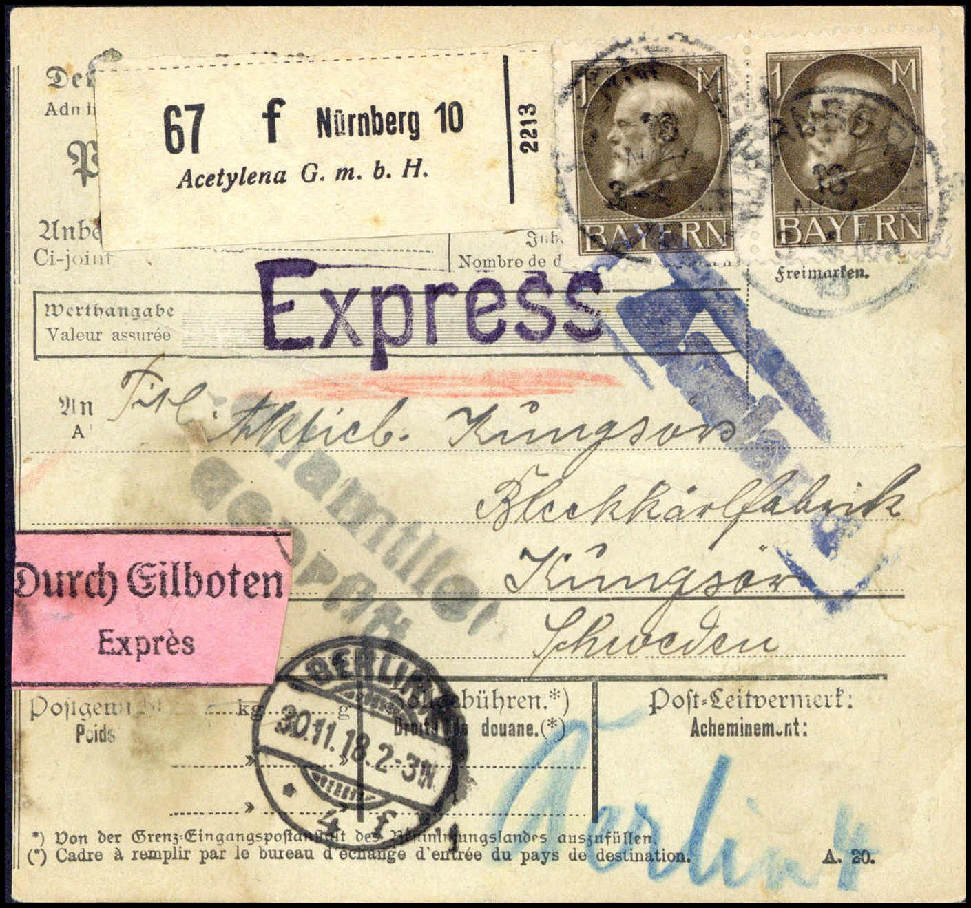 1 Mk., waagr. Paar als Mehrfachfrankatur auf seltener Eilboten-Paketkarte nach Schweden, Stempel NUERNBERG 10. 18/11 18 (Beförd.-Spuren)