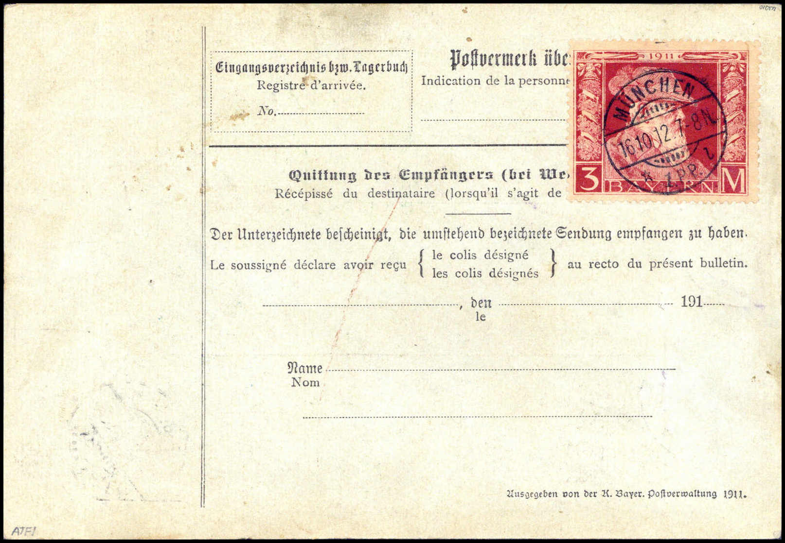 3 Mk., tadelloses Exemplar mit ideal klar und zentr. Stempel MÜNCHEN 16/10 12 rs. auf Eilboten-Paketkarte (vs. mit 30 und 40 Pfg. frankiert) in die Schweiz