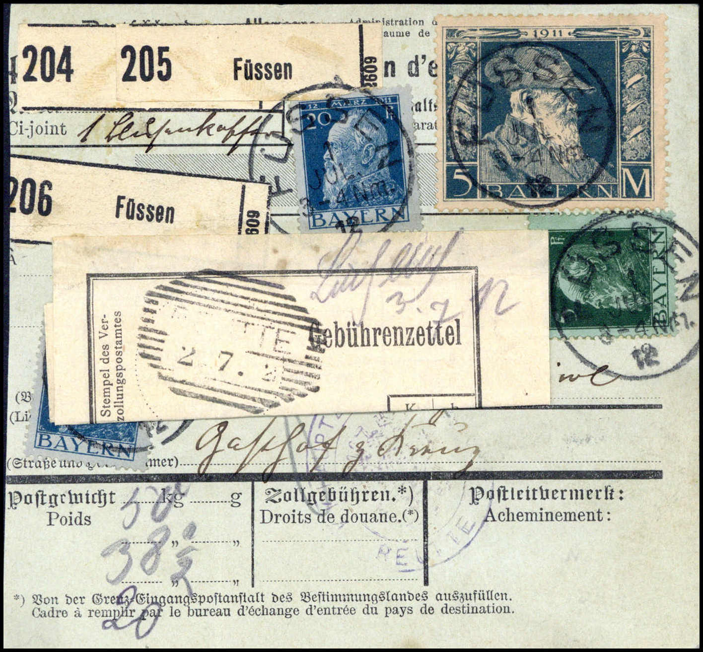 5 Mk. mit 5 und 20 Pfg. auf Paketkarte mit klaren Stempeln FÜSSEN 1/7 12 nebst Gebührenzettel auf Paketkarte nach Tirol, rs. Dreierblock österr. Portomarken 4 H