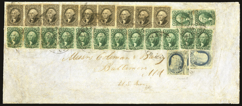 (9/17/31/32/33) Stunning tri-color 1851-61 Issue franked cover sent from California to Maryland including three (17) 12¢ black Washington horizontal strips of three, positions 74–76R1, 64–66R1, and 86–88R1, used in combination with two (9) 1¢ Type IV stamps and fourteen 10¢ green perforated Types I, II, and III stamps — tied by bold "San Francisco Cal. Oct. 10, 1857" cds cancels on large blue cover addressed to Coleman & Bailey, Baltimore, Maryland, ....Est.US$5,000-7,500
