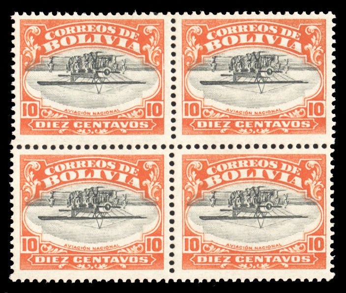 Lot 225 - BOLIVIA (C1a) 1924 Aviation School, 10 centavos vermilion & black, Center Inverted, block of four, well centered, n.h., post office fresh, v.f., with 2017 Sismondo certificate. A rare block, one of only two multiples of any size recorded, from a total printing of fifty, cat. value $17000....Est.US$4,500-5,000 Sold for US$ 4,500