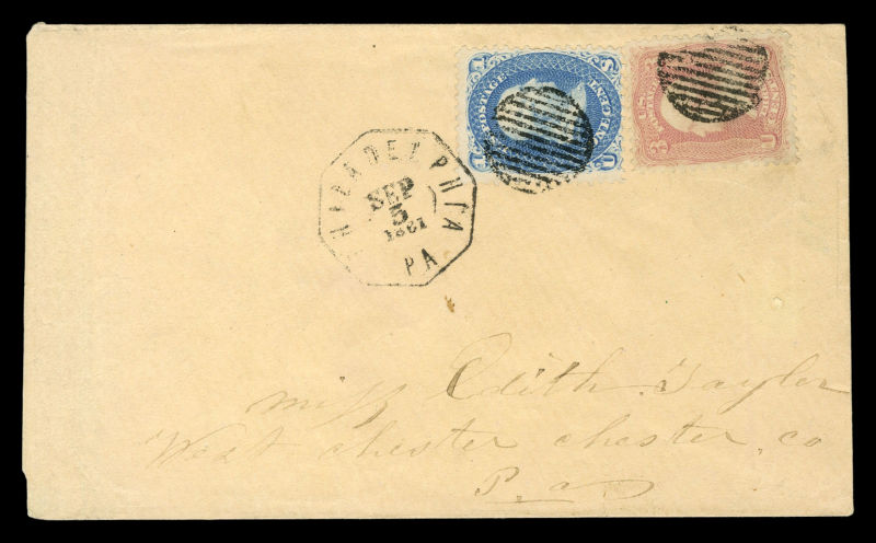 21 c   image(63,64) 1861 1c blue Franklin and 3c pink Washington tied by black grid cancels with matching "Philadelphia PA Sep 5, 1861" cds also tying 1c stamp paying the carrier rate on cover to West Chester, Pennsylvania. A fine, early use of the 1861 Issue stamps from Philadelphia.