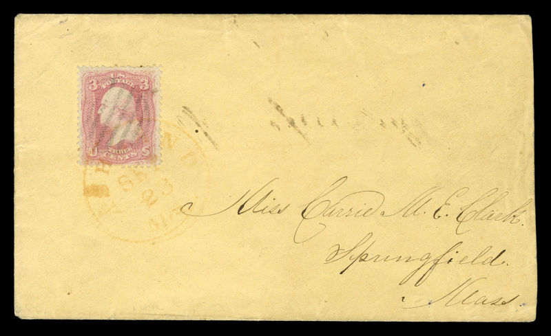 24 c   image(64b) 1861 3c pinkish rose Washington tied by red Massachusetts cds with "Nov. 1861" manuscript docketing below on cover to Westfield, Massachusetts with note on reverse by Stanley Ashbrook - "This is not a pink but a pinkish rose referred to as a near pink" - a very fine example of this 1861 3c shade on cover.