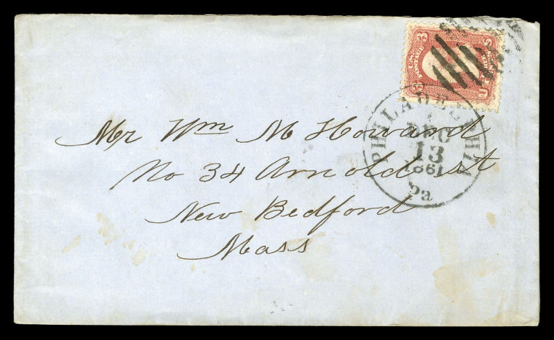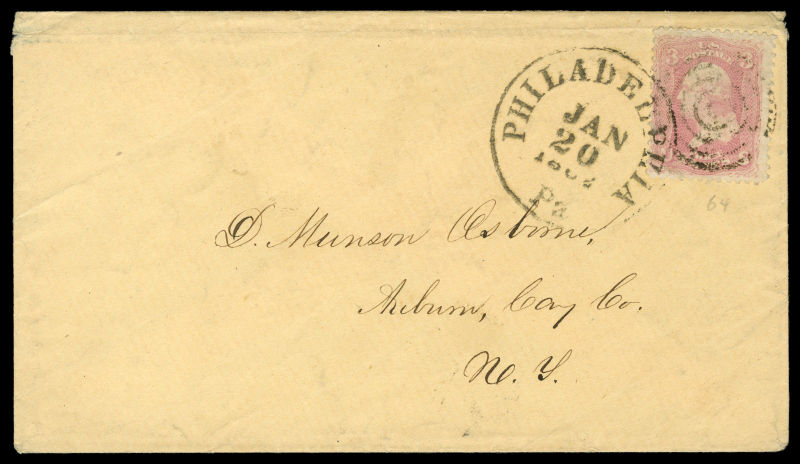 25 c   image(64,64b) Pair of 1861 3c Issue covers - the first 3c is a dark rose shade tied by "Philadelphia, Pa Dec 13 1861" cds and additional oval shaped bar cancel on cover to New Bedford, Massachusetts and the second 3c is a pink shade tied by "Philadelphia, Pa Jan 20 1862" cds and circular target cancel on cover to Auburn, New York, fine. (Image) (Image 2) (All Images)