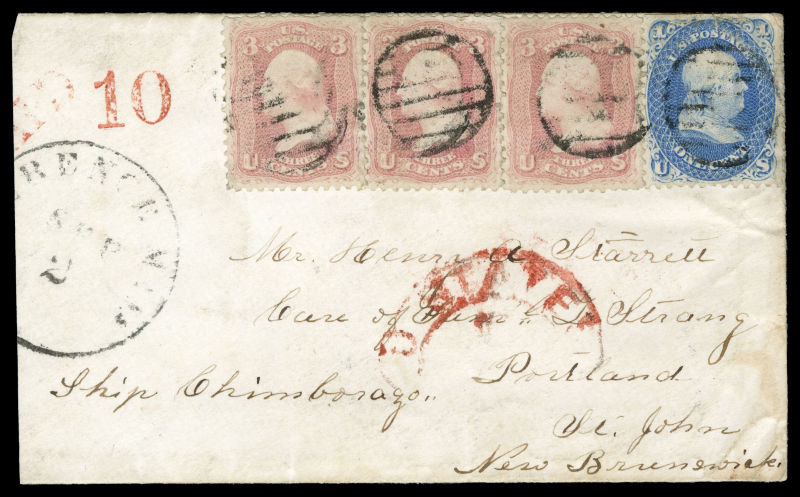 26 c   image(63,64) 1861 1c blue Franklin and three 3c pink Washington singles, all tied by black grid cancels on cover to New Brunswick, Canada with matching black "Lawrence Me. Sep 2" (1861) cds at left and red "U STATES" in arc exchange marking at center and "PAID 10" top left, manuscript "Ship Chimborazo" at lower left. Minor cover edge wear and stamps slightly affected from placement at edge, still overall a fine and attractive treaty-rate cover. The stamps pay the 10c treaty rate for mail traveling over 300 miles and under 3,000 miles to New Brunswick via Portland, Maine - under the U.S.–British North America postal treaty in effect prior to Canadian Confederation in 1867.