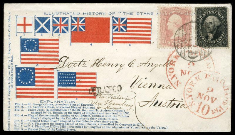 27 c   image(36b,64) 1857-61 12c black and 1861 3c pink Washington, tied by bold strike of large black "Paid" in grid cancel on elaborate full-color "Illustrated History of the Stars and Stripes" patriotic cover to Dr. Henry C. Angell in Vienna, Austria. Red "N. York Hamb. Pkt. PAID 2 Nov 10 (1861)" cds repeated twice at right, reflecting the fully prepaid 15¢ transatlantic rate via the Teutonia (Hamburg Line) for letters up to ½ oz. Hamburg transit and Vienna receiving backstamps, 12c stamp with small part of bottom left corner missing, likely a result from the original sheet separation and nick at top right, repaired backflap tear, though still extremely fine appearing overall.