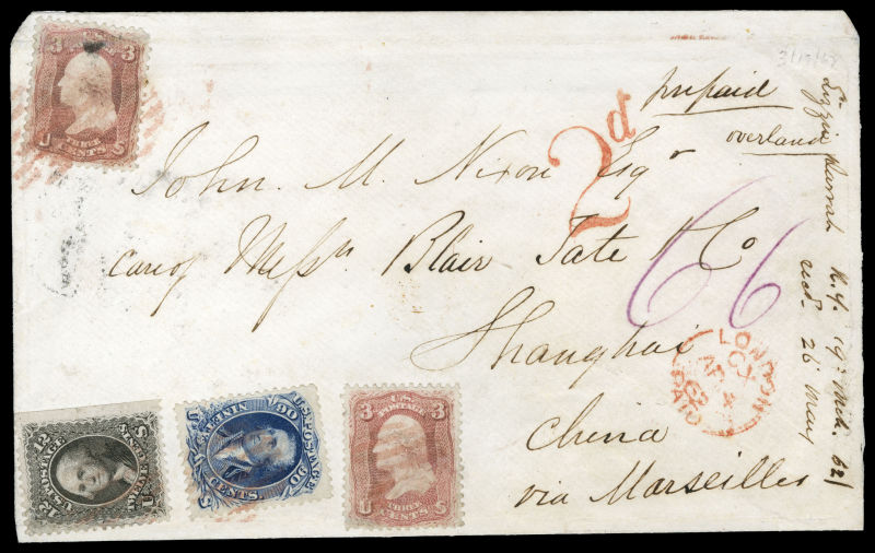 28 c   image(65,69,72) 1861 3c rose, two singles, 12c black, and 90c blue Washington, all used by red grid cancels on cover from New York addressed to John M. Nixon, care of Blair Tate & Co. in Shanghai, China with black "New York Am. Pkt. Mar. 22" (1862) exchange office backstamp. Additional magenta manuscript "66" credit, red "London Paid AP 4 '62" transit, bold red "2d" British Colonial credit handstamp, and "Hong Kong MY 2 '62" receiving backstamp. Endorsed "prepaid overland" and "via Marseilles" by sender. Both 3c stamps defective, bottom one skillfully repaired with part of the design portion added, and cover refolded along top and bottom for display, still with an overall fine appearance.
