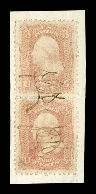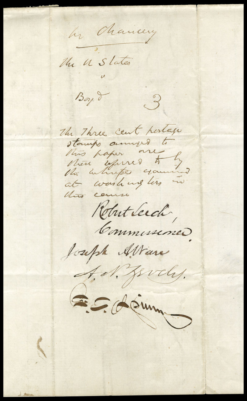 #3. Block of six 3c stamps, each with manuscript “3”, affixed to a folded letter dated May 9, 1867, sent to Robert Leech, U.S. Commissioner. This formal attestation was signed on the front by representatives of both plaintiffs and defendants, and on the reverse by Leech, Francis Spinner (Treasurer of the United States), Joseph A. Ware, and A.N. Zevely (later Third Assistant Postmaster General).