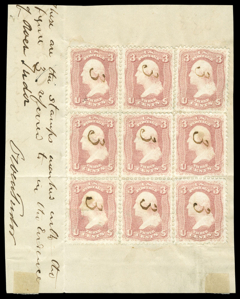 #1. Block of nine 1861 3c stamps, each marked with a manuscript “3” and accompanied by a signed attestation: “These are the stamps marked with the figure 3 referred to in the evidence of Owen Tudor,” with Tudor’s signature below.