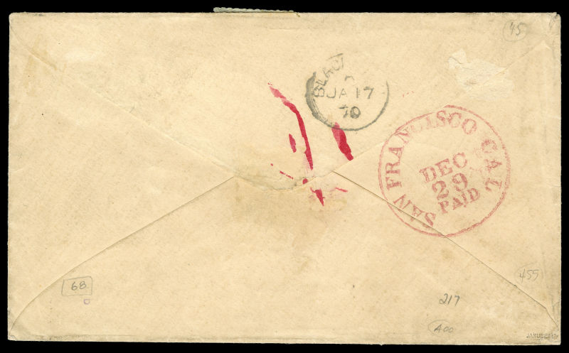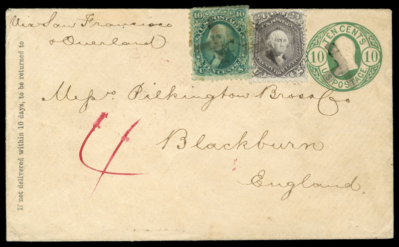 31 c   image(78/96/U41) 1861-68 10c green Washington F Grill & 24c dark lilac Washington used on 1861 10c entire all with black "X" chop cancels of the U.S. Postal Agency in Yokohama, Japan on cover to Pilkington Bros. in Blackburn, England, with manuscript directive "via San Francisco & overland" at top left. Carried aboard the "China" of the Pacific Mail Steamship Co., departing Yokohama on December 3, 1869 and arriving in San Francisco on December 25. A magenta "San Francisco, Cal. Dec 29 PAID" cds appears on the reverse, along with a Blackburn receiving backstamp dated January 17, 1870.
