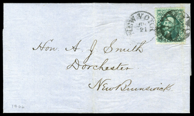 35 c   image(68) 1861 10c green Washington tied by black "New York Jun 21" (1866) cds and geometric cancel on folded letter sent by ship to Dorchester, New Brunswick with "Saint Johns, N.B. June 26 1866" receiving backstamp. The stamp affected by file fold but overall still a very fine appearing example of New York to New Brunswick pre-confederation U.S.-Canada postal history.