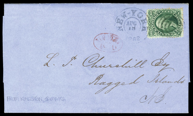 36 c   image(68) 1861 10c green Washington tied by black "New York Aug 18 1862" cds and matching grid cancel on folded letter originating in Jamaica and addressed to Ragged Islands, Nova Scotia. The letter is datelined Kingston, Jamaica on August 7, 1862, and was privately carried or "bootlegged" from Jamaica to New York, where it entered the U.S. mails without any foreign transit markings as usual. Struck with red "U.S. 10cts, Paid" oval handstamp indicating prepayment of the U.S.-Canada treaty rate, additional Halifax "AU 23 1862" transit and "Ragged Islands AU 26 1862" receiving backstamps.
