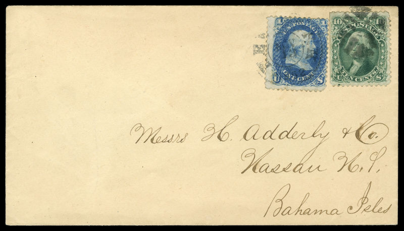 37 c   image(63,68) 1861 10c green Washington and 1c blue Franklin tied by black "New York Nov 13 1862" cds and matching geometric cancel paying the 1c carrier fee for pickup from the sender and double-weight letter rate from New York to Nassau, Bahamas. A desirable and fine cover from New York to the Bahamas with carrier fee paid by an 1861 1c stamp.