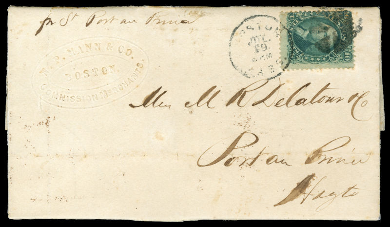 38 c   image(96) 1868 10c yellow green Washington F Grill tied by bold strike of "Boston Mass. Jul. 19" duplex datestamp on 1869-dated folded letter to Port-au-Prince, Haiti, with merchant's embossed cornercard at left for N. P. Mann & Co. Commission Merchants. The stamp has small perf flaws, though still a fine and uncommon destination with postage paid by an 1868 10c F Grill.