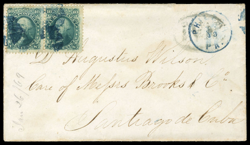 39 c   image(68) 1861 10c green Washington horizontal pair tied by blue cancels and matching clear strike of blue Philadelphia, Pa. cds on cover to Augustus Wilson in Santiago, Cuba, care of Messrs. Brooks & Co. Strike of “NA” in circle due marking applied over Philadelphia cds upon arrival in Cuba.