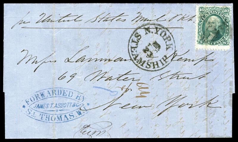40 c   image(96) 1868 10c yellow green Washington F Grill tied by black cork cancel on folded letter datelined St. Lucia, December 10, 1868, addressed to New York City. The letter was carried privately to St. Thomas, Danish West Indies, where it was forwarded into the U.S. mails by James T. Abbott & Co., indicated by large blue oval “Forwarded By / James T. Abbott & Co. / St. Thomas W.I.” handstamp at left and “N. York Steamship Dec 23 (1868)” cds at center applied upon arrival into New York City. The 10c U.S. franking paid the standard incoming rate from the D.W.I. to the United States. The letter was carried by American steamship service from St. Thomas to New York under the mail contract of the time.