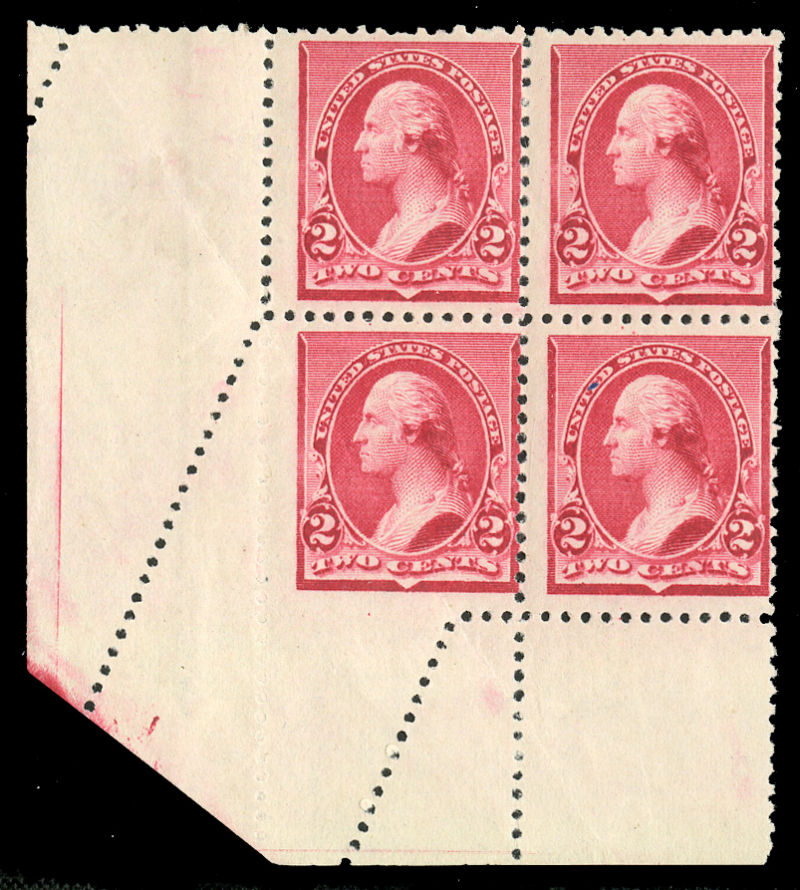 1890-93 Issue (220var) 1890 2c carmine, lower left margin block of four with dramatic fold-over variety, n.h., fine (Image)
