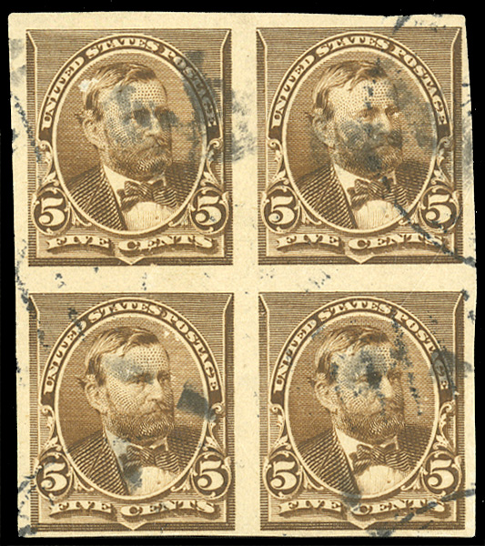 1890-93 Issue (223P5) 1890 5c yellow brown, imperf. block of four, used, small thin spots and tiny surface scrapes, uncommon item, with 1987 PFC (Image)