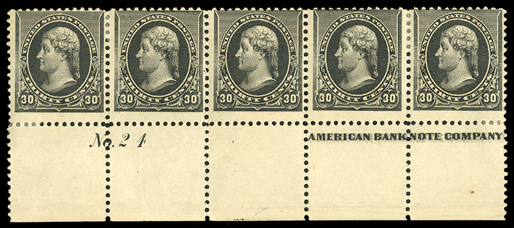 1890-93 Issue (228) 1890 30c black, Bottom Plate Number, imprint strip of five, heavy h.r., rich color, fine, cat. Value $1900 (Image)