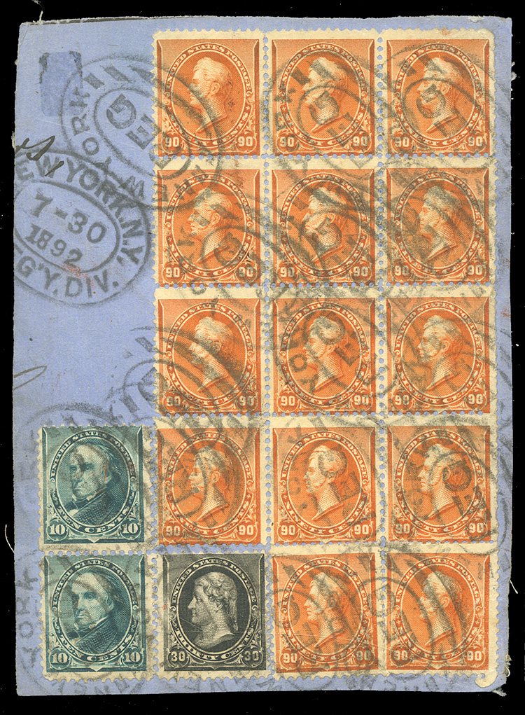 1890-93 Issue (229) 1890 90c orange, block of 14 used in combination with 10c green (2) and single 30c black on large piece of registered cover, top right and bottom right stamps perf. flaws, with 2019 PFC. An impressive piece, believed to be the