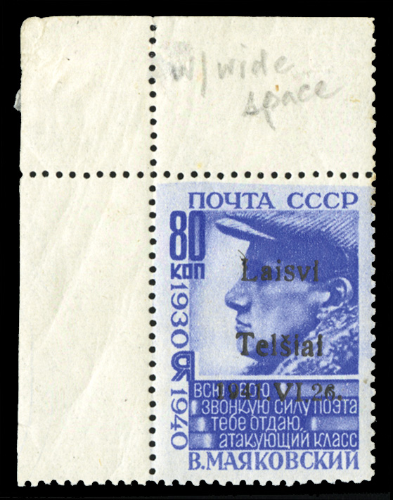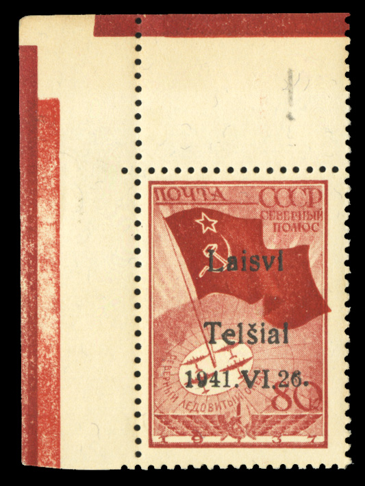 WORLD WAR II OCCUPATION ISSUES Lithuania - Telsiai (Mi.8IIaPFVIII) 1941 80k red, upper left sheet corner margin single with wide space between "Laisvi" and "Telsiai" variety, h.r., v.f. and rare, only 37 printed, with 2011 Krischke certificate, (Image)