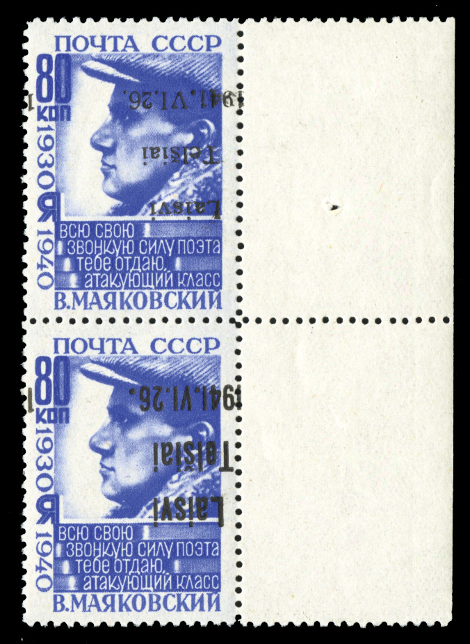 WORLD WAR II OCCUPATION ISSUES Lithuania - Telsiai (Mi.9I/IIIbK) 1941 80k ultramarine, overprint inverted, sheet margin se-tenant vertical pair, types I and III, n.h., v.f. and extremely rare showpiece, with 2011 Krischke certificate (Euro 11,200) (Image)