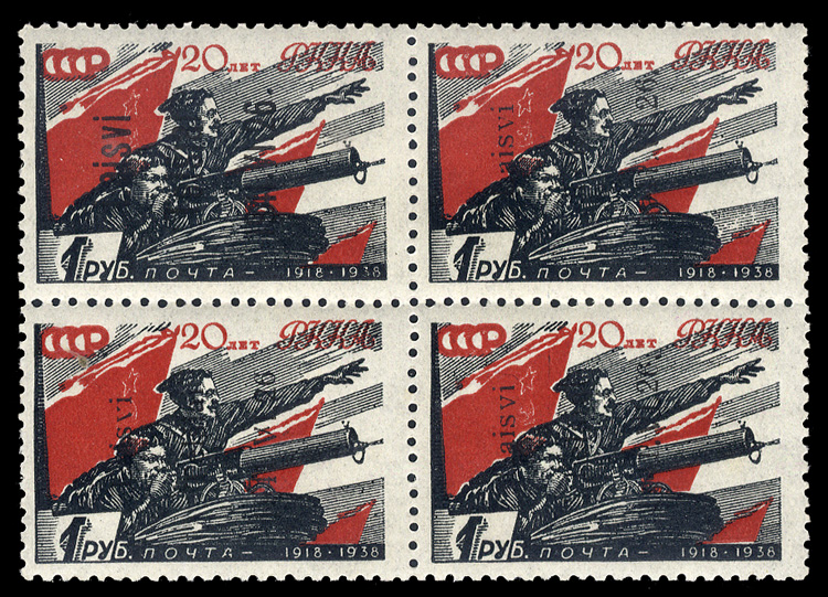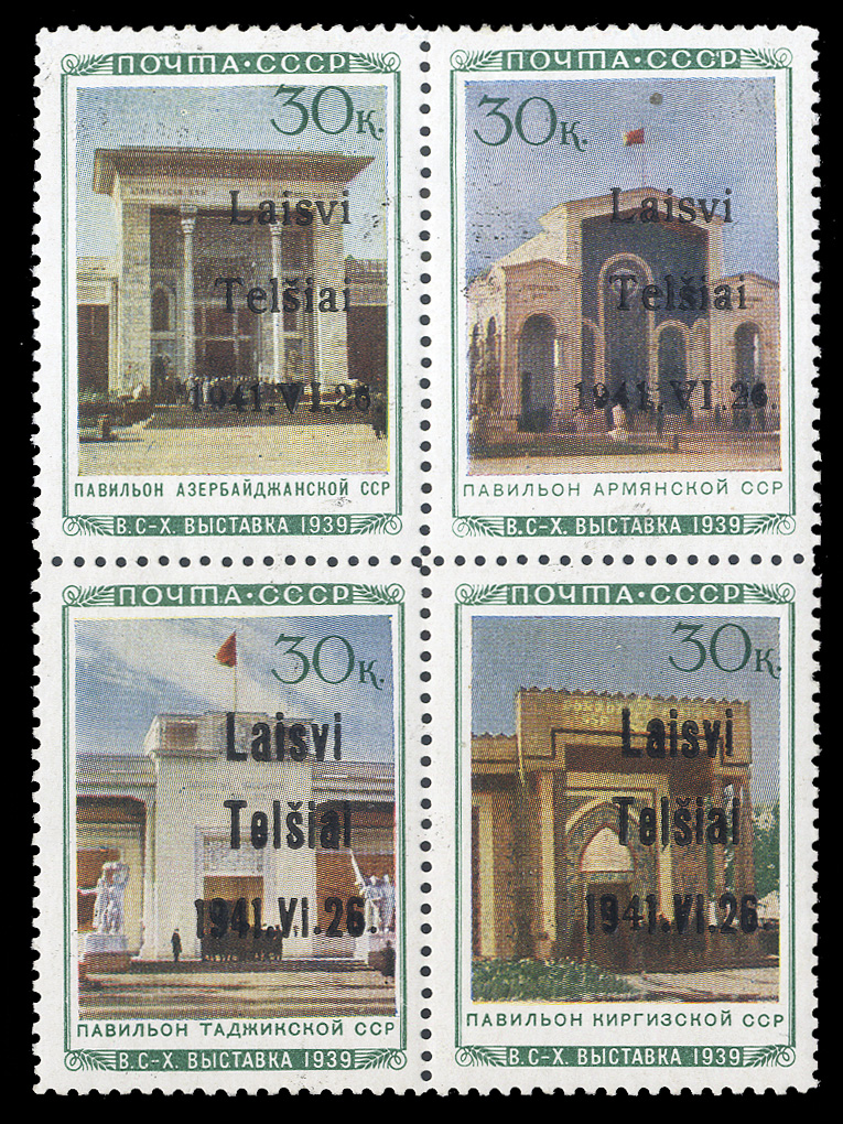 WORLD WAR II OCCUPATION ISSUES Lithuania - Telsiai 1941 Pavilions, se-tenant combination block of four from the "heart" of the sheet, first printing (Azerbaijan + Armenia + Tajikistan + Kyrgyzstan), top stamps type II, bottom stamps type III, h.r.,