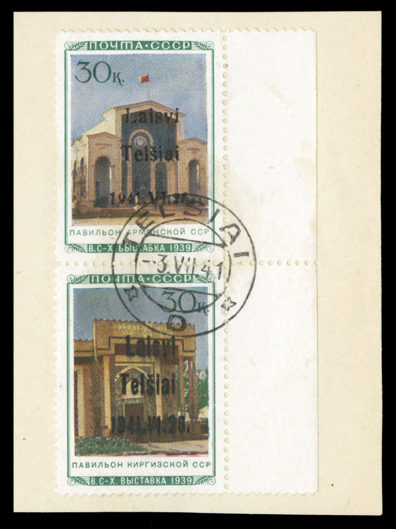 WORLD WAR II OCCUPATION ISSUES Lithuania - Telsiai (Mi.18II,20IIIa) 1941 Azerbaijan and Tajikistan Pavilions, vertical sheet margin se-tenant pair, first printing, type II+III, canceled by Telsiai 3.VII.41 cds on piece, v.f. and rare, with 2011