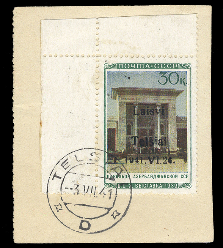 WORLD WAR II OCCUPATION ISSUES Lithuania - Telsiai (Mi.18IIh) 1941 Azerbaijan Pavilion, upper left sheet corner margin single, first printing, type II, with wide space between "Laisvi and Telsiai", used on piece, v.f., only 13 issued, with 2011