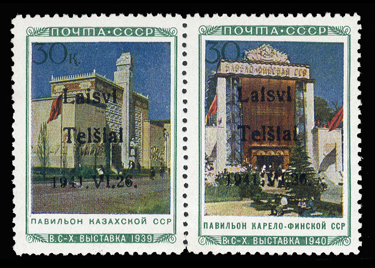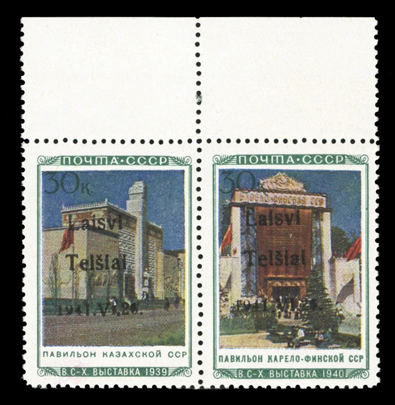 WORLD WAR II OCCUPATION ISSUES Lithuania - Telsiai (Mi.22-23II) 1941 Kazakh and Karelia Pavilions, se-tenant to sheet margin horizontal pair, type II, pos.9-10, n.h., v.f. and rare, with 2007 Krischke certificate (Euro 6,000) (Image)