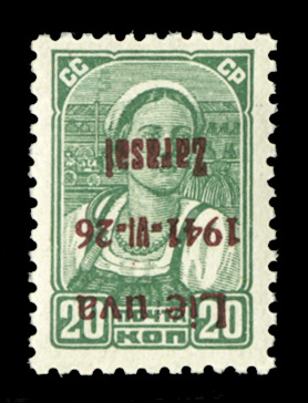 WORLD WAR II OCCUPATION ISSUES Lithuania - Zarasai (Mi.4bII BKAFI) 1941 20k green, red overprint inverted, n.h., rare unlisted variety, probably from the trial sheet, with handstamp guarantee (Euro 7,200) (Image)