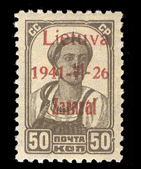 WORLD WAR II OCCUPATION ISSUES Lithuania - Zarasai (Mi.6bVIII) 1941 50k brown, brown lilac overprint, type III, pos.40, short "6" (in "26") variety, l.h. (if at all), v.f. and rare, with 2011 Krischke certificate (Image)