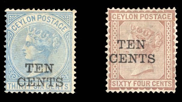 COMMONWEALTH CEYLON (103,104) 1885 surcharges 10c on 36c and 10c on 64c, unused, minor flaws, fine, cat. Value $900 (Image)