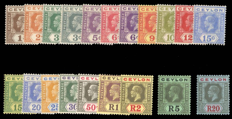 COMMONWEALTH CEYLON (225-44) 1921-27 George V, 1c-20r complete set of 20, l.h., fine-v.f. (SG 338-57) cat. Value $455 (Image)