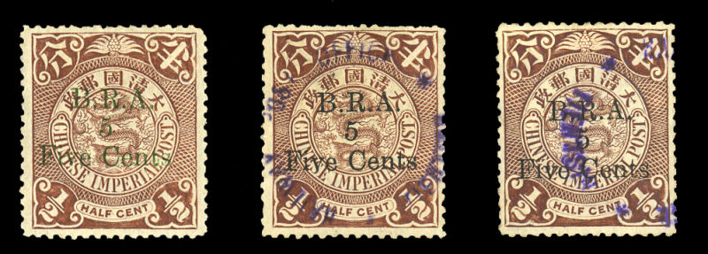 COMMONWEALTH CHINA - BRITISH RAILWAY ADMINISTRATION (SG BR133,133b) 1901 1/2c brown surcharged "B.R.A. 5 / Five Cents" in green, h.r., also in black, two used singles canceled in Peking and Tientsin, fine-v.f. (Image)