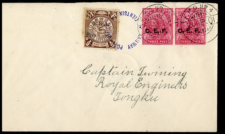COMMONWEALTH CHINA - BRITISH RAILWAY ADMINISTRATION (SG BR133A) 1901 1/2c brown surcharged "B.R.A. 5 / Five Cents" inverted, canceled by violet "Field Post Office No.20, May 3,1901" Tientsin pmk on cover, used in combination with India C.E.F. 1/2a,