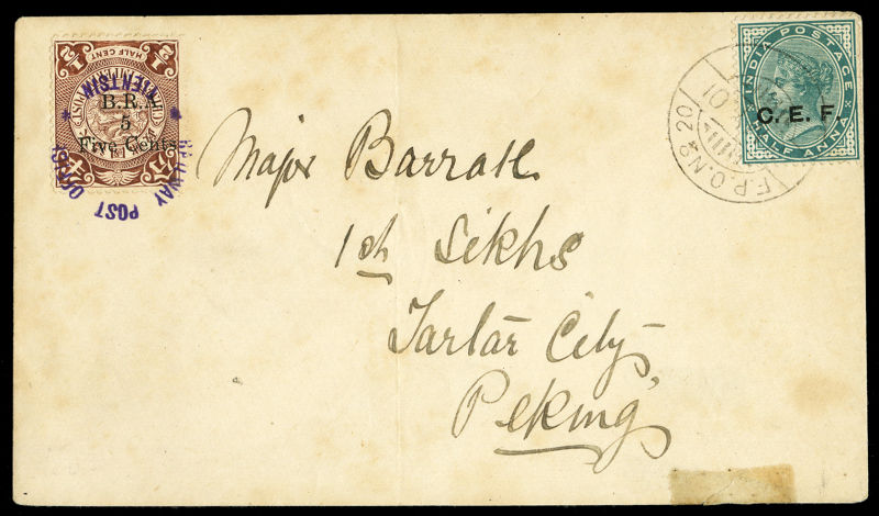 Station) on cover used in combination with India C.E.F. 1/2a green, tied by "BASE Office 20 Apr 1901" cds, addressed to Major C.A.R. Browne R.E., Tientsin, with Base Office B 20 Apr 1901 (located in Tientsin) arrival pmk on back, v.f. First Day of