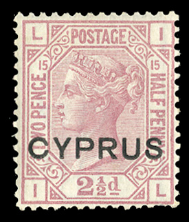 COMMONWEALTH CYPRUS (3var) 1880 1 1/2p claret, Plate 15, variety watermark inverted, l.h., irregular perforations at bottom, otherwise fine. A scarce variety (SG3w, £750)