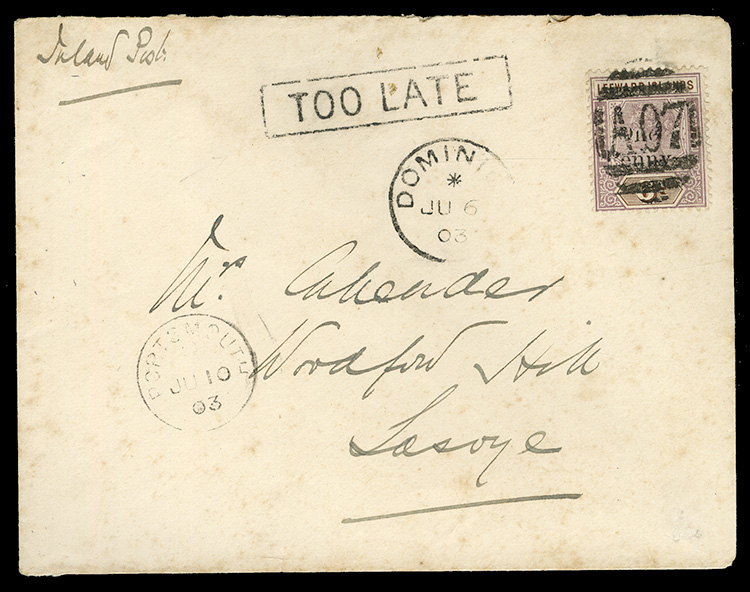 COMMONWEALTH DOMINICA 1906 (6 July) cover endorsed "Inland Post', franked with Leeward Islands 1p on 6p lilac & brown (18), canceled by "A07" duplex, with "Dominica" cds alongside, Portsmouth July 10 03 arrival at left, framed "Too Late", fine (Image)